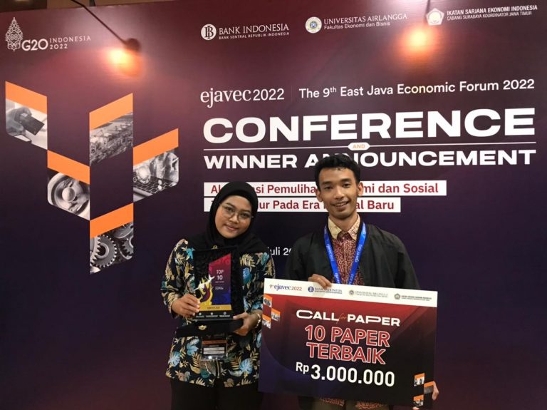 UNAIR NEWS – Prestasi membanggakan kembali datang dari Fakultas Ekonomi dan Bisnis (FEB) Universitas Airlangga (UNAIR). Dua mahasiswa Program studi Ekonomi Pembangunan FEB UNAIR, Mohammad Ichsan Verianto dan Rosa Diwanegara berhasil menyabet gelar best paper pada lomba Call For Paper kategori mahasiswa, East Java Economic (EJAVEC) Forum 2022.