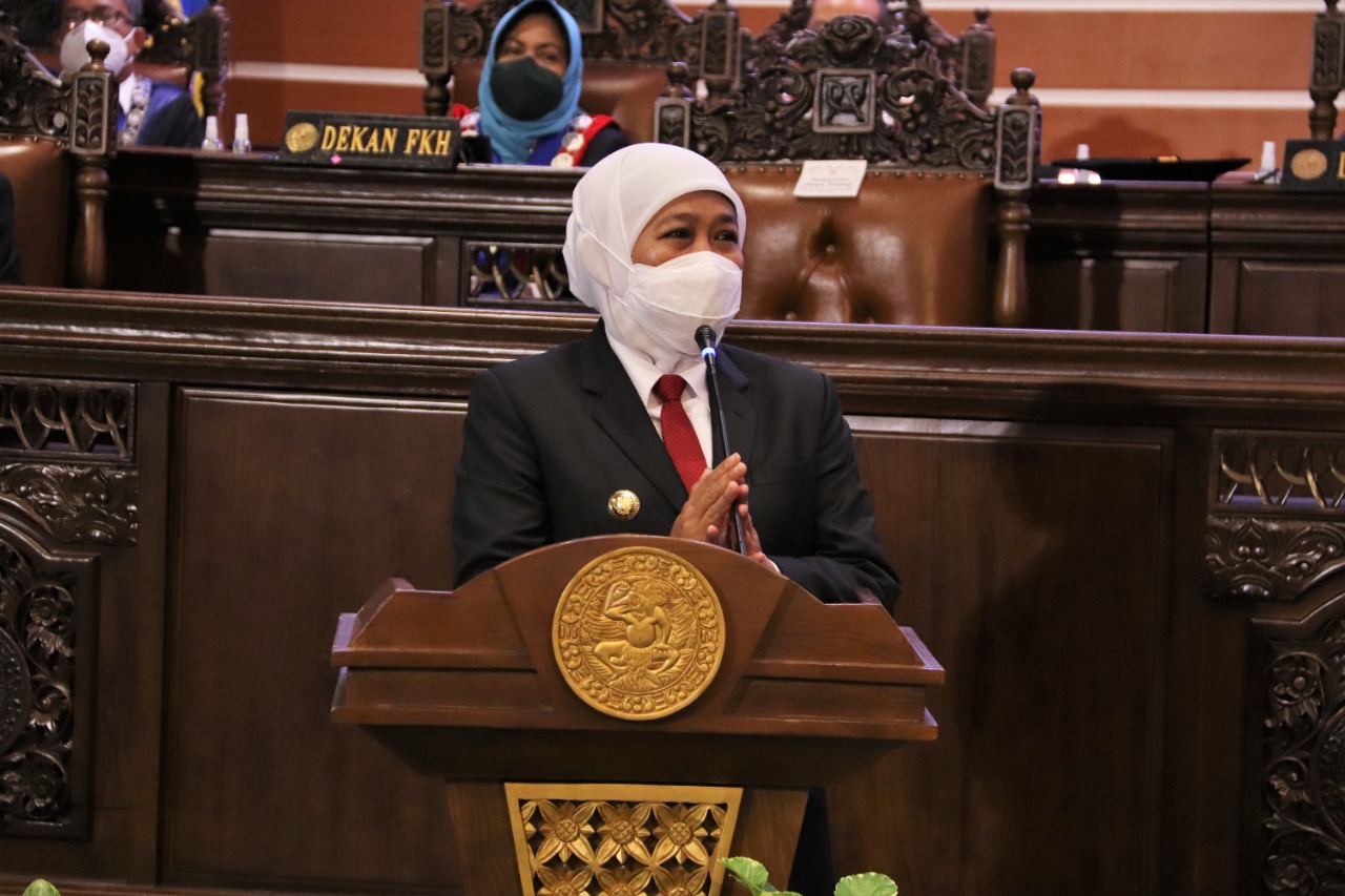 UNAIR NEWS – Dra. Hj. Khofifah Indar Parawansa, M.Si. selaku Gubernur Jawa Timur turut menghadiri acara Sidang Terbuka Dies Natalis Universitas Airlangga (UNAIR) ke-67 pada Selasa (9/11/21). Dalam kesempatan tersebut, Khofifah menyatakan kesiapannya dalam mendukung proses percepatan uji klinik vaksin merah putih buatan UNAIR mulai dari tahap pertama hingga tahap ketiga.
