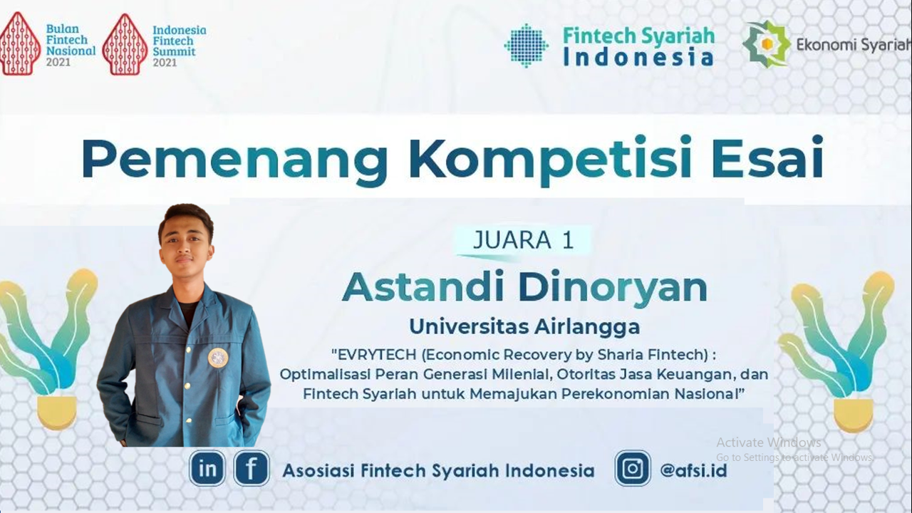 UNAIR NEWS – Tahun baru semangat baru. Astandi Dinoryan kembali menorehkan prestasi gemilang di kancah nasional. Astandi berhasil menyabet Juara I dalam Kompetisi Esai Nasional Asosiasi Fintech Syariah Indonesia (AFSI). Ia mengalahkan 74 peserta lain dari 35 universitas di Indonesia pada awal Januari lalu.