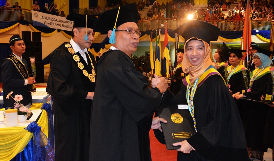FARIANI Syahrul ketika menerima piagam penghargaan dari Rektor UNAIR Prof. M. Nasih disaksikan Ketua Senat Akademik Prof. Joewono Soeroso. (Foto: Bambang Bes)