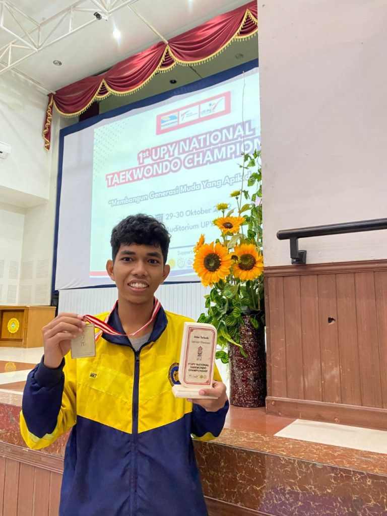 UNAIR NEWS – Prestasi membanggakan kembali ditorehkan oleh Unit Kegiatan Mahasiswa (UKM) Taekwondo Universitas Airlangga (UNAIR). Kali ini Gigih Mahardika, salah satu anggota UKM Taekwondo UNAIR, berhasil menjuarai Kyorugi Senior Prestasi Male Under 54 KG di kejuaraan 1st UPY National Taekwondo Championship 2022. Selain itu, Gigih juga dinobatkan sebagai atlet terbaik senior prestasi pada ajang yang sama.