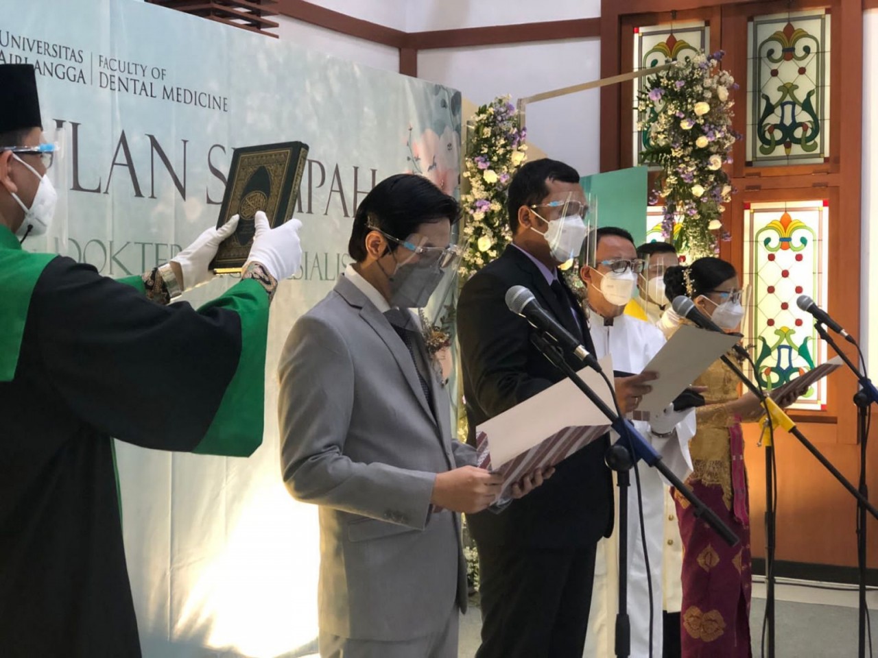 UNAIR NEWS – Pelaksanaan Pelantikan Dokter Gigi Spesialis Fakultas Kedokteran Gigi (FKG) Universitas Airlangga mewarnai momentum kemerdekaan Indonesia. Pasalnya, ada 89 Dokter Gigi dan Dokter Spesialis yang diambil sumpahnya pada Minggu (22/8/2021), tak lama usai Indonesia merayakan kemerdekaan ke-76.