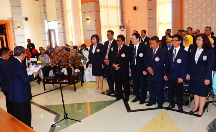 KETUA I IKA-UA Drs. Ec. Haryanto Bayoeni ketika melantik pengurus IKA-UA Wilayah Jawa Timur, Sabtu (4/2) di UTM Madura. (Foto: Bambang Bes)