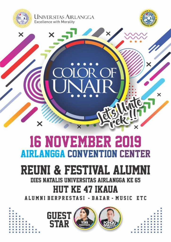 Jangan lewatkan keseruan acara Color Of Unair, Let's Unite Rek!! Akan ada guest star spesial Vina Panduwinata & Pongki Barata.
