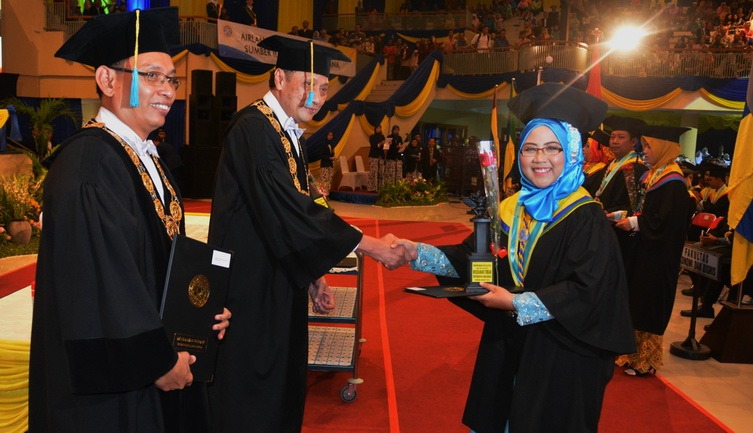 KETUA Senat Akademik Universitas Airlangga Prof. Joewono Soeroso memberi ucapan selamat usai menyerahkan Piala suvenir wisudawan terbaik kepada Raditya Weka Nugraheni, disaksikan Rektor UNAIR Prof. Moh. Nasih. (Foto: Bambang Bes)