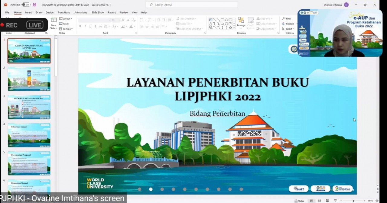 Ovarine Imtihana, S.IIP, M.A Koordinator Bidang Penerbitan LIPJPHKI menyampaikan bahwa program ketahanan buku ini diperuntukkan bagi penulis yang merupakan dosen UNAIR. Naskah yang dapat diusulkan, lanjutnya, adalah buku teks atau buku ajar dan belum pernah diterbitkan di penerbit lain. Selain itu, pengusul juga akan mendapatkan keuntungan seperti review dari editor tersertifikasi dan pendampingan penulisan.