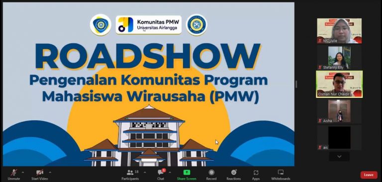 UNAIR NEWS – Komunitas Program Mahasiswa Wirausaha (PMW) Universitas Airlangga (UNAIR) mengenalkan diri melalui roadshow pada Sabtu (15/10/2022). Dalam kegiatan daring tersebut, komunitas ini menekankan pentingnya kolaborasi antar organisasi mahasiswa (ormawa) dengan Direktorat Pengembangan Karir, Inkubasi Kewirausahaan, dan Alumni (DPKKA) UNAIR.
