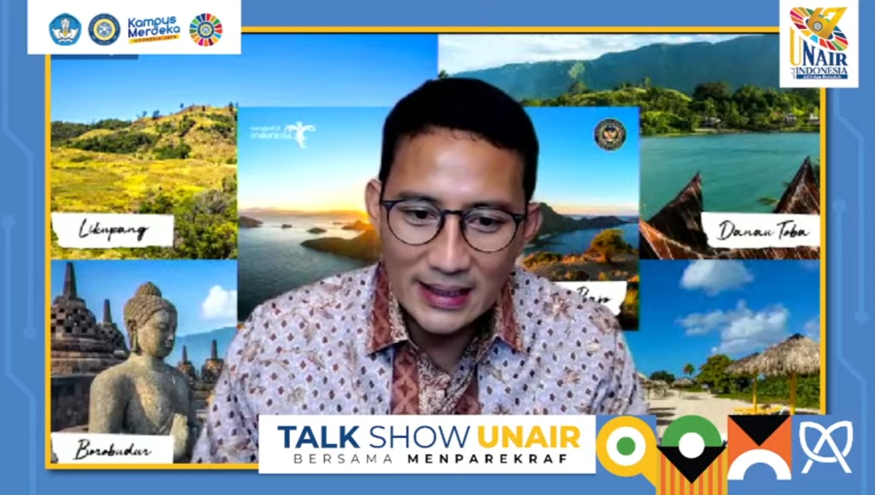 UNAIR NEWS – Peringatan 67 Tahun Universitas Airlangga (UNAIR) diramaikan oleh kehadiran Menteri Pariwisata dan Ekonomi Kreatif (Menparekraf) Sandiaga Uno. Kamis (18/11/2021), Sandiaga dalam pidatonya menyebut 3G sebagai kunci pertumbuhan industri digital nasional.
