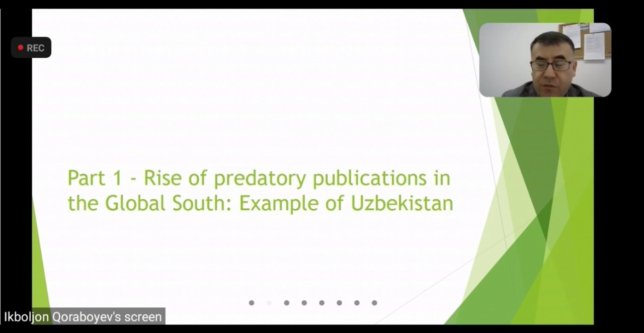Pada awal, Ikboljon menjelaskan masuknya publikasi predator dalam ilmu sosial menyebabkan adanya peningkatan publikasi jurnal di Ubezkistan yang terindeks Scopus. Ikboljon menyatakan bahwa sejak tahun 2019 peningkatan publikasi jurnal terindeks Scopus sangat tinggi namun ternyata sebagian besar publikasi tersebut muncul di jurnal yang kemudian dihentikan Scopus.