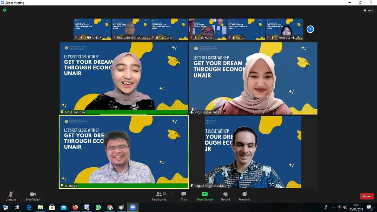 Untuk mempermudah Siswa SMA sederajat dalam merencanakan proses pendidikan, program studi (Prodi) ekonomi pembangunan (EP) fakultas ekonomi dan bisnis Universitas Airlangga (UNAIR) menggelar open house pada sabtu (27/3/2022). Acara dengan tema Get Your Dream Through Economics UNAIR itu mengenalkan pembelajaran dan prospek karir dari lulusan EP UNAIR.
