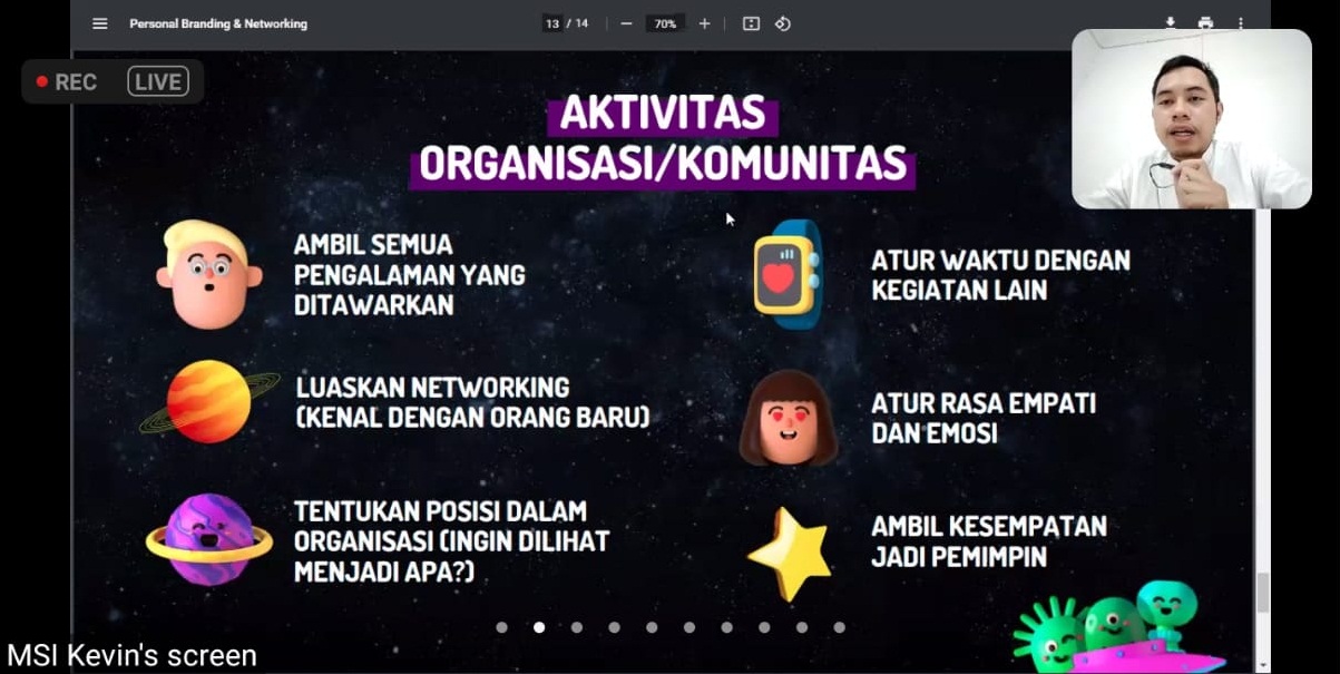 UNAIR NEWS – Direktorat Pengembangan Karir, Inkubasi Kewirausahaan, dan Alumni (DPKKA) Universitas Airlangga (UNAIR) bekerja sama dengan Magnet Solusi Integra (MSI) Alpha kembali mengadakan webinar dalam rangkaian acara Career Booster Series. Diselenggarakan pada Sabtu (11/9/21), kegiatan webinar tersebut mengambil tema Personal Branding and Networking.