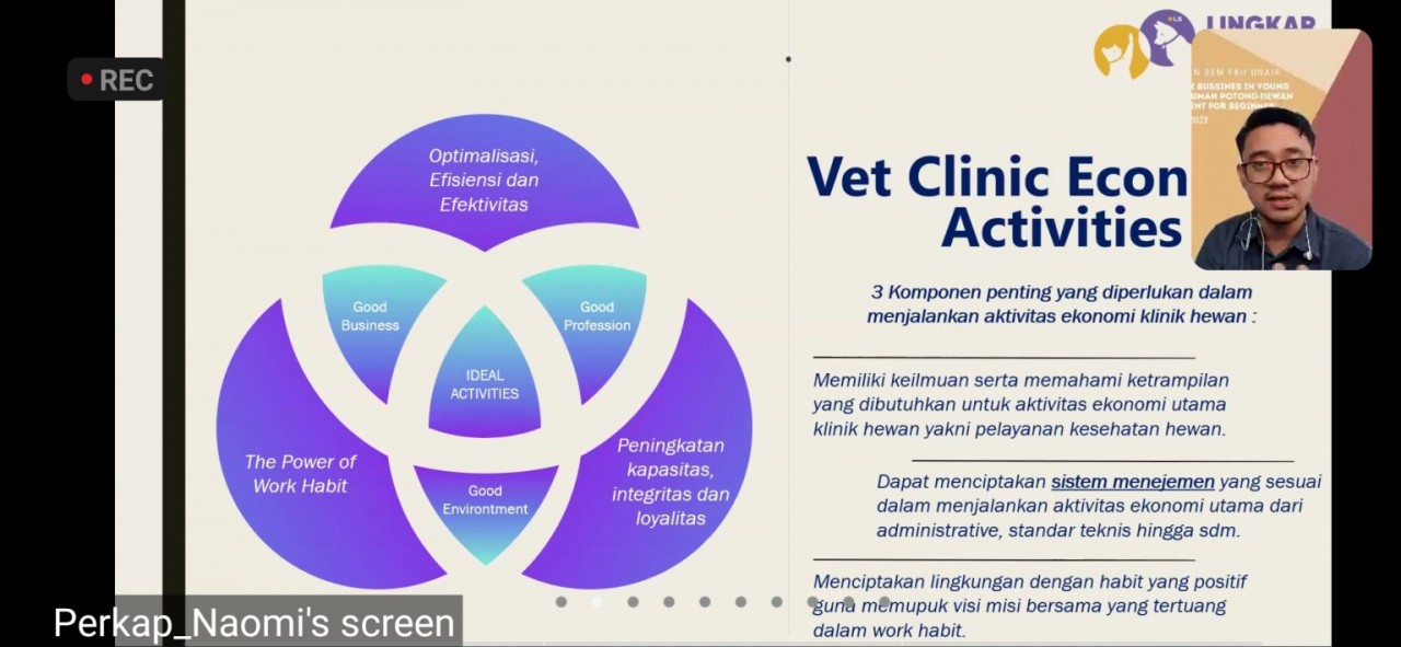 UNAIR NEWS – Ada beberapa komponen penting yang diperlukan dalam menjalankan aktivitas ekonomi di bidang klinik hewan diantaranya yaitu memiliki keilmuan serta memahami keterampilan yang dibutuhkan untuk pelayanan kesehatan hewan. Kedua, dapat menciptakan sistem manajemen yang sesuai dalam menjalankan aktivitas ekonomi utamanya dari administratif, standar teknis hingga sumber daya manusia serta menciptakan lingkungan dengan habit yang positif guna memupuk visi misi bersama yang tertuang dalam work habit.