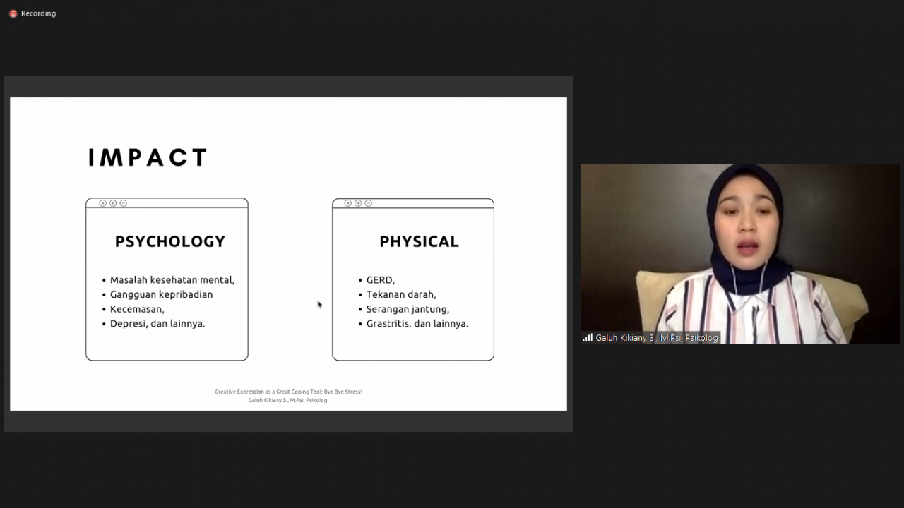 Pada webinar yang diadakan oleh Airlangga Safe Space (ASAP), platform daring kesehatan mental yang berada di bawah Departemen Brading Badan Eksekutif Mahasiswa Keluarga Mahasiswa (BEM KM) Fakultas Psikologi Universitas Airlangga (UNAIR) itu, Kiki banyak menjabarkan mengenai creative expression sebagai salah satu sarana koping dalam menghadapi stres.