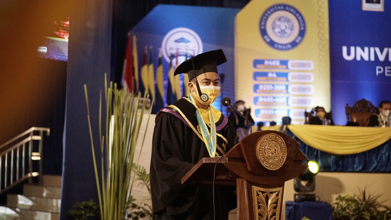 “Kami (wisudawan, red) mengucapkan banyak terima kasih kepada keluarga, pasangan, dan guru-guru kami yang telah mendukung kami hingga hari ini. Kami juga mengucapkan terima kasih kepada pimpinan universitas dan fakultas yang telah memberikan kami fasilitas terbaik selama pembelajaran. Mohon maaf bila kami belum memberikan yang terbaik bagi almamater,” tukasnya.