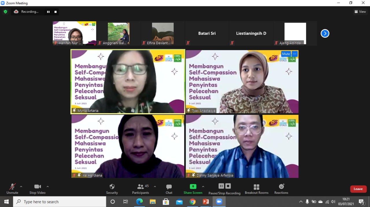 Gelaran bertajuk ‘Membangun Self-Compassion Mahasiswa Penyintas Pelecehan Seksual’ itu diadakan secara daring melalui webinar pada Sabtu (3/7/2021). Terdapat tiga pemateri yang hadir dalam acara tersebut, yakni Guru Besar Antropologi UNAIR Prof. Dra. Myrtati Dyah Artaria, MA., Ph.D.; Pakar Psikologi UNAIR Dr. Ike Herdiana, M.Psi., Psikolog; serta Dosen Psikologi Klinis UNAIR Danny Sanjaya Arfensia, S.Psi.