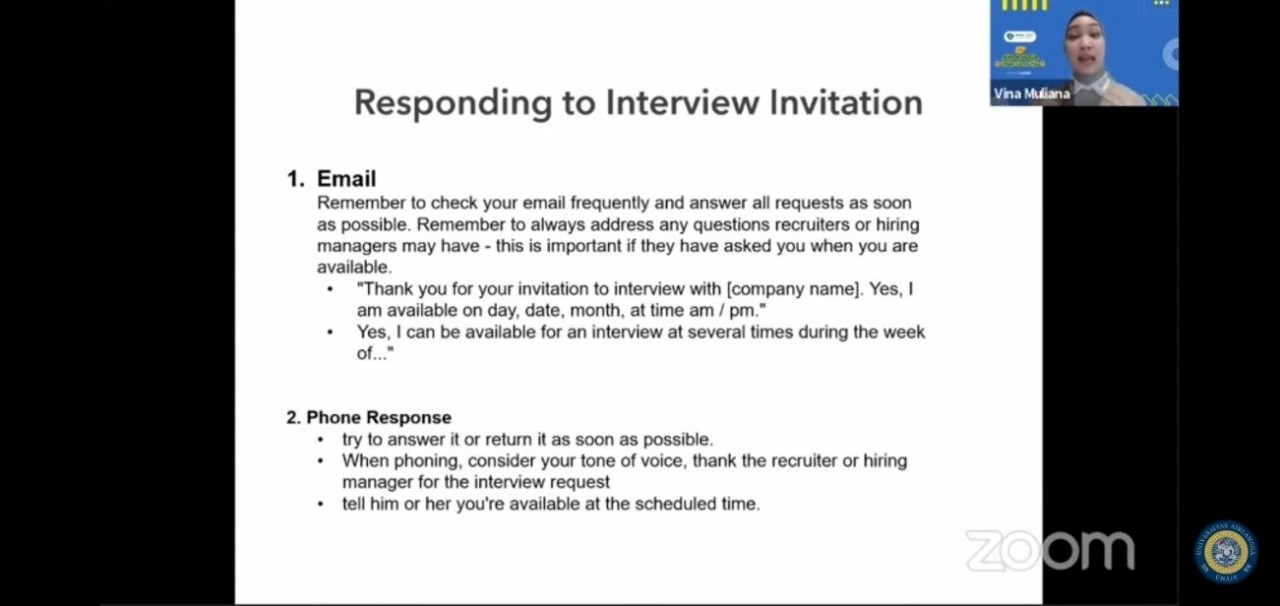 “Kalau misalnya teman-teman mendapat undangan wawancara kerja sebenarnya bagaimana sih, caranya merespon dengan baik? Kalau misalnya lewat e-mail tentu saja teman-teman bisa meresponya dengan segera. Kalau kemudian ditelepon tentu saja teman-teman juga harus langsung menjawab dengan cepat, dan bertanya secara detail mengenai interview,” jelasnya.