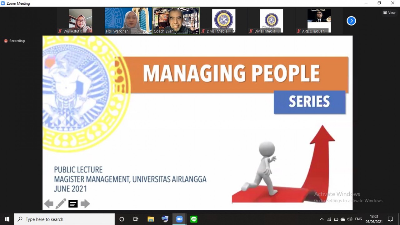 UNAIR NEWS – Kinerja karyawan pada perusahaan memiiki peranan penting kesuksesan dan perkembangan perusahaan. Apalagi saat pandemi seperti saat ini, banyak perusahaan mengalami kemrosotan dan banyak karyawan dirumahkan. Menanggapi hal itu, Master of Human Resource Management Sekolah Pascasarjana Universitas Airlangga (UNAIR) mengadakan kuliah umum dengan tema managing people.