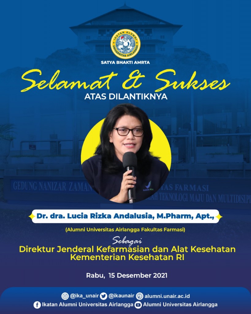 Selamat dan Sukses atas dilantiknya kepada Dr. dr. Lucia Rizka Andalusia, M.Pharm, Apt., sebagai Direktur Jenderal Kefarmasian dan Alat Kesehatan Kementerian Kesehatan Republik Indonesia.