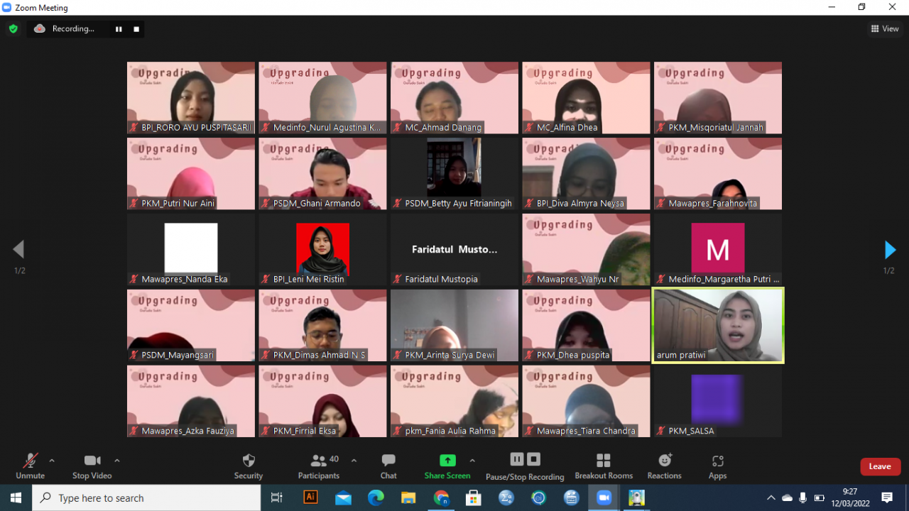 UNAIR NEWS – Garuda Sakti (GS) merupakan organisasi yang menaungi mahasiswa UNAIR dalam bidang prestasi dan akademik. Dalam hal ini, skill kepengurusan harus tetap dikembangkan guna kelancaran internal kerja di dalamnya. Mengenai hal tersebut, Divisi Pengembangan Sumber Daya Mahasiswa (PSDM) menggelar acara Upgrading pada Sabtu secara daring (12/03/2022). Agenda itu merupakan program kerja kedua usai dilaksanakannya Welcome Party pada Februari lalu.