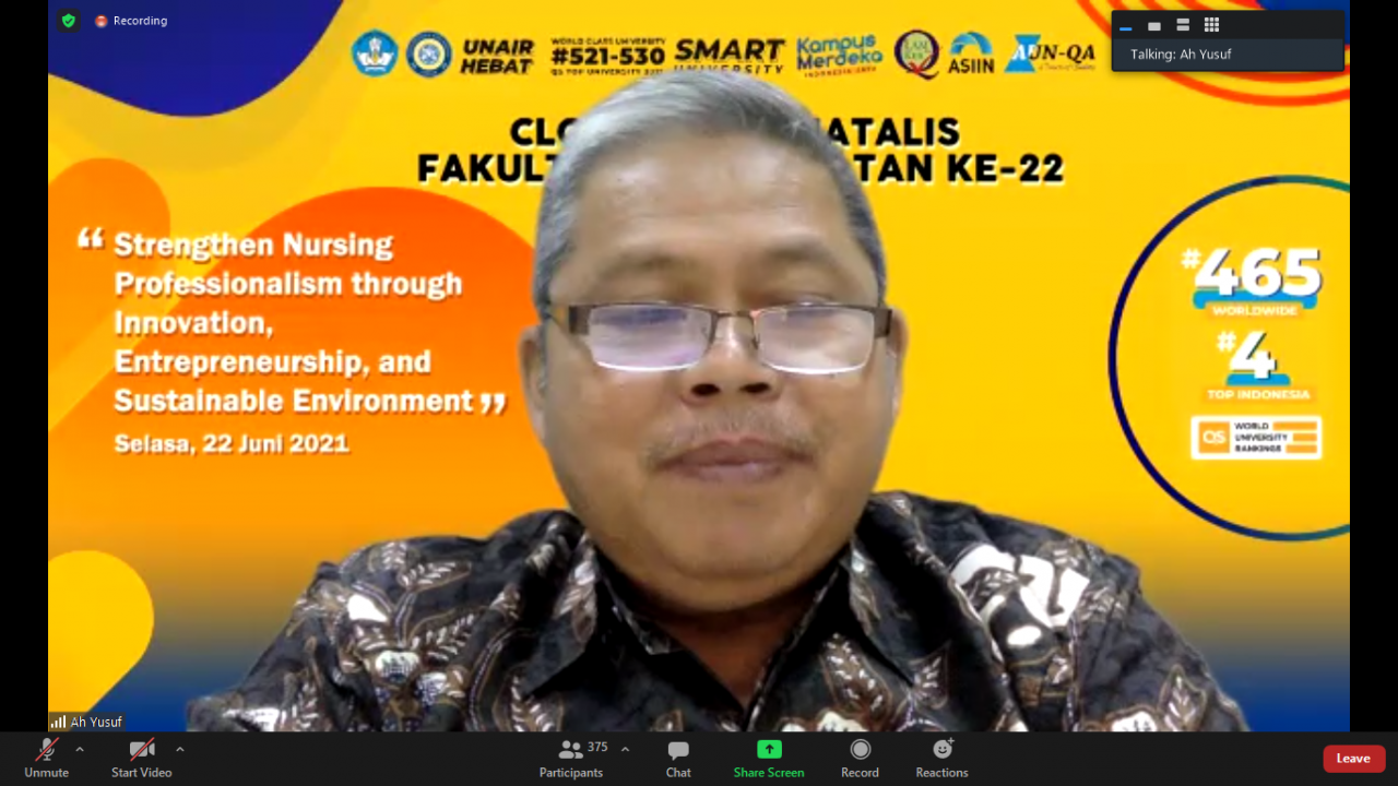 UNAIR NEWS – Dies natalis ke-22 Fakultas Keperawatan Universitas Airlangga (FKp UNAIR) yang diselenggarakan sejak April lalu resmi ditutup pada Selasa (22/6/2021) via daring. Penutupan dihadiri oleh Dekan Prof. Dr. Ah. Yusuf, S.Kp., M.Kes beserta jajarannya, para guru besar FKp UNAIR, ketua Ikatan Alumni (IKA) FKp, dosen, mahasiswa serta segenap undangan.