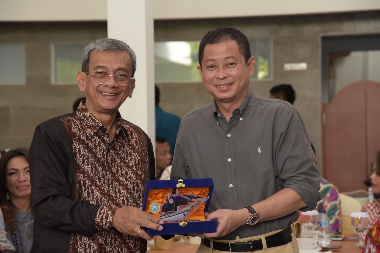Menteri ESDM Ignasius Jonan yang merupakan alumni UNAIR saat menerima cinderamata dari Ketua IKA UA Hariyanto Basuni. (Foto: Istimewa)