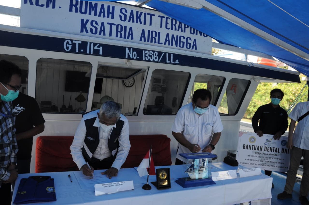 UNAIR NEWS – Rumah Sakit Terapung Ksatria Airlangga (RSTKA) bakal membuka fasilitas layanan gigi untuk masyarakat kepulauan di Indonesia. Memorandum of Understanding telah ditandatangani RSTKA bersama dengan Fakultas kedokteran Gigi (FKG) Universitas Airlangga pada Jum’at (19/3/2021) di atas kapal RSTKA di Pelabuhan Kalimas Pos 5 Tanjung Perak.