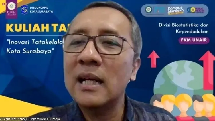 UNAIR NEWS – Fakultas Kesehatan Masyarakat Universitas Airlangga (FKM UNAIR) bekerja sama dengan Dinas Kependudukan dan Pencatatan Sipil (Dispendukcapil) Kota Surabaya menggelar kuliah tamu dengan tema Inovasi Tata Kelola Kependudukan di Kota Surabaya. Dalam acara yang diselenggarakan pada Jumat (16/12/2022) secara online tersebut hadir sebagai narasumber utama Agus Imam Sonhaji ST MMT Kepala Dispendukcapil Kota Surabaya.