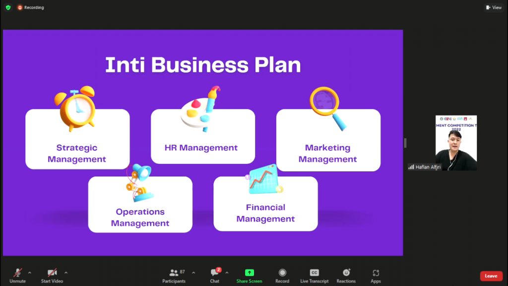 Haflan Alfiri Widrayat SM, alumni Fakultas Ekonomi dan Bisnis Universitas Airlangga (UNAIR) membahas inti rancangan bisnis dalam Management Competition Training 2022 Session 2 yang diadakan oleh Himpunan Mahasiswa (HIMA) Manajemen UNAIR pada Minggu (16/10/2022). Webinar ini nantinya akan dilanjutkan dengan sesi pelatihan khusus bagi mahasiswa program studi Manajemen sebagai bekal menuju Business Plan Competition.