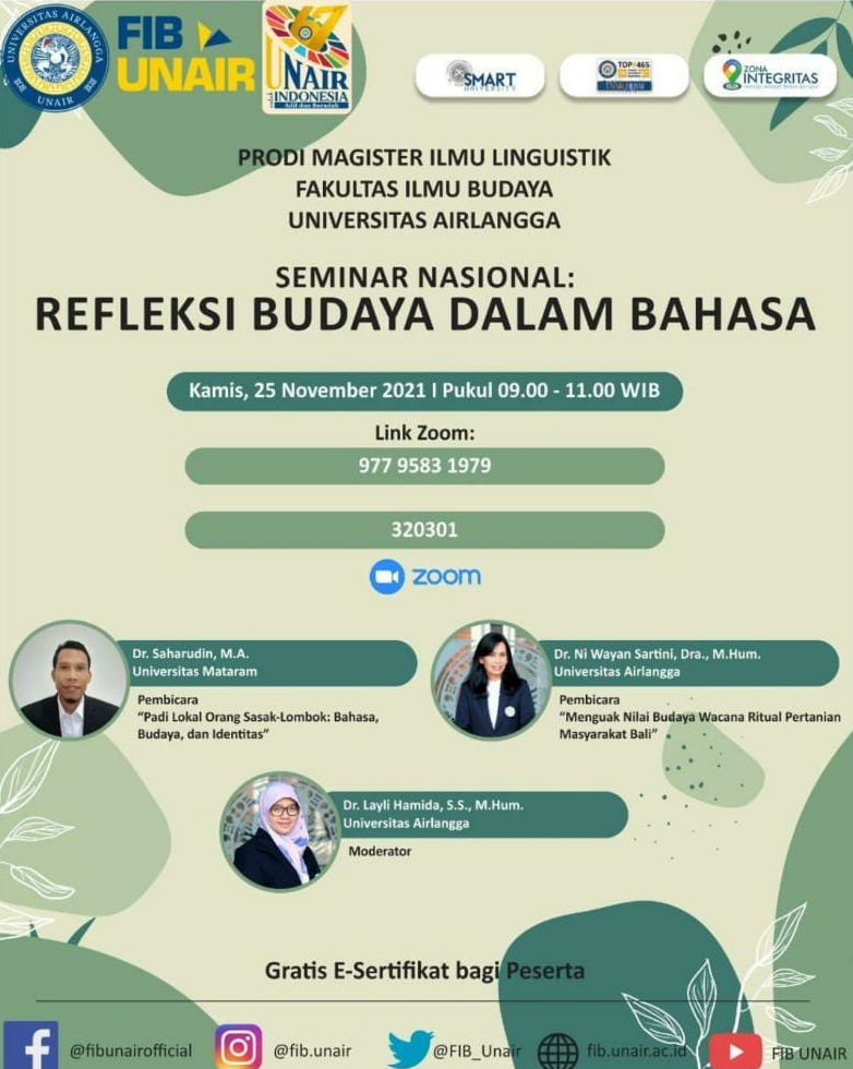 UNAIR NEWS – Program Studi Magister Ilmu Linguistik Universitas Airlangga (UNAIR) menggelar seminar nasional bertajuk Refleksi Budaya dalam Bahasa. Secara virtual, acara tersebut diselenggarakan pada Kamis (25/11/2021). Sebagai pembicara, hadir Dr. Saharudin, M.A dari Universitas Mataram dan Dr. Ni Wayan Sartini, M.Hum dari Universitas Airlangga.