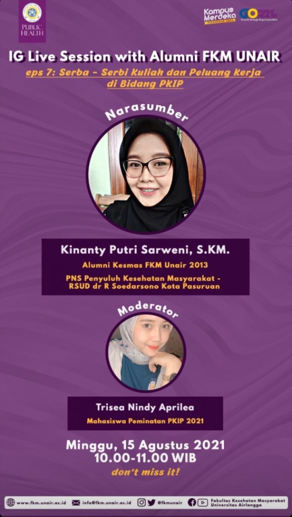 UNAIR NEWS – Fakultas Kesehatan Masyarakat kembali mengadakan Instagram Live Session eps.7 : Serba-Serbi Kuliah dan Peluang Kerja di Bidang Promosi Kesehatan dan Ilmu Perilaku (PKIP). Sharing Alumni kali ini mengundang Kinanty Putri Sarweni S.Km, Alumni Kesehatan Masyarakat (Kesmas) Fakultas Kesehatan Masyarakat (FKM) Universitas Airlangga (UNAIR) angkatan 2013 dan dimoderatori oleh Trisea Nindy Aprilea, mahasiswa peminatan Promosi Kesehatan dan Ilmu Perilaku (PKIP) 2021.