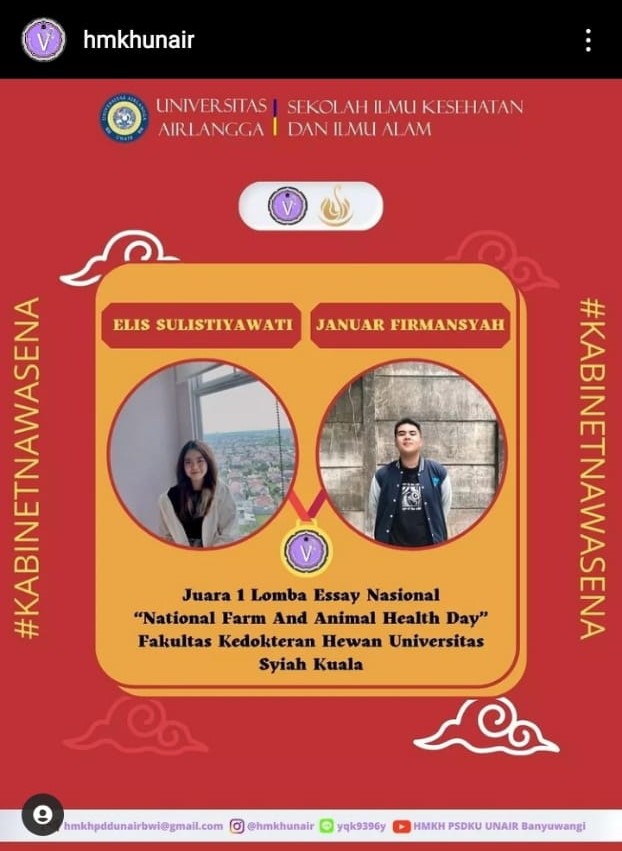 UNAIR NEWS – Prestasi membanggakan kembali ditorehkan oleh dua mahasiswa Fakultas Kedokteran Hewan, Sekolah Ilmu Kesehatan dan Ilmu Alam, Universitas Airlangga (FKH SIKIA UNAIR). Mereka adalah Januar Firmansyah dan Elis Sulistiyawati. Pada kegiatan lomba esai yang diselenggarakan oleh Universitas Syiah Kuala dengan tema National Farm and Animal Health Day, kedua mahasiswa tersebut berhasil menyabet Juara I dengan mengusung gagasan berupa aplikasi INDUKAN (Informasi Dunia Peternakan).