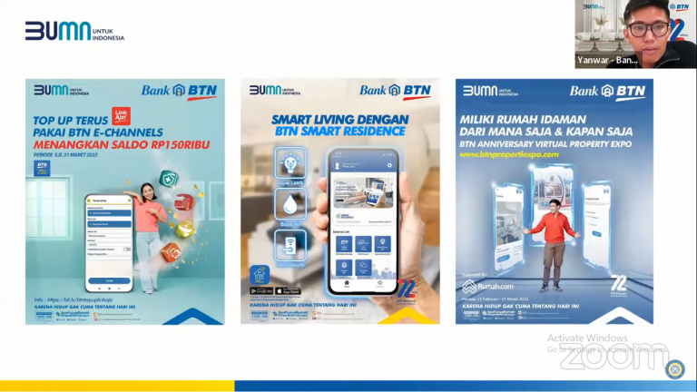 Yanwar Eka Akbar selaku bagian dari Internal & Experienced Hiring Officer memandu jalannya webinar yang dimulai dari pengenalan Bank BTN itu. Ia mengemukakan bahwa bank yang telah berdiri selama 72 tahun itu memiliki beragam fasilitas, contohnya seperti pembayaran keperluan rumah tangga dalam lingkup perumahan yang tengah berkolaborasi bersama Bank BTN.