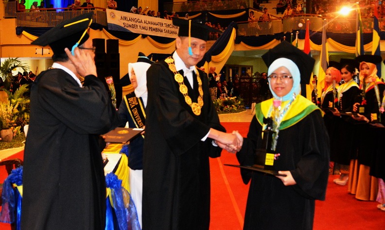 KOYUKI ketika menerima piagam dan piala sebagai wisudawan terbaik dari Ketua Senat Akademik UNAIR Prof. Joewono Soeroso, disaksikan Rektor UNAIR. (Foto: Bambang Bes)