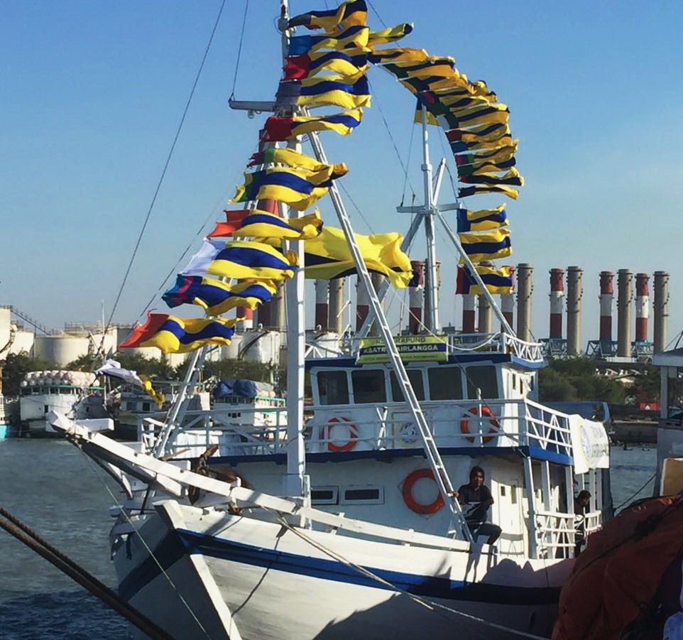 Kapal RST "Ksatria Airlangga" sandar di Pelabuhan Gresik, Jumat (15/9) penuh dengan bendera semua fakultas yang ada di UNAIR. (Foto: Helda)