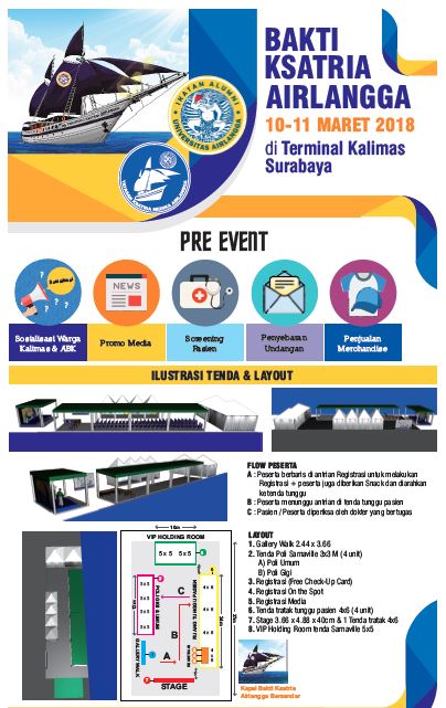 IKA UNAIR kembali mempersembahkan pelayanan kesehatan Rumah Sakit Terapung. Acara ini akan berlangsung selama 2 hari dan terselenggara dalam waktu 4 hari lagi di wilayah PT Pelabuhan Indonesia III (Persero) jalan Kalimas Surabaya. Pelayanan kesehatan ini terbuka bagi umum. Para alumni UNAIR mengadakan pelayanan kesehatan sebagai bentuk wujud aksi nyata UNAIR bagi negeri Indonesia tercinta. Dengan terjun langsung dan menyentuh kepada masyarakat umum secara lebih dekat lagi. Bagi anda alumni UNAIR juga dapat berpartisipasi dalam acara ini. Untuk rincian dan runtutan acara yang lebih jelas bisa anda lihat pada gambar berikut ini.